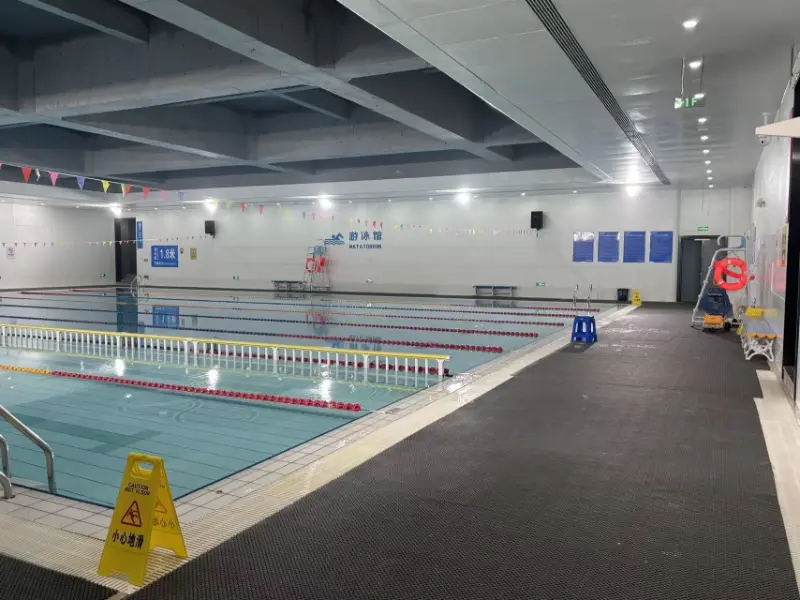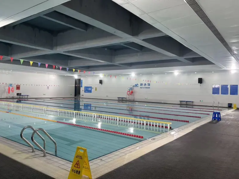 Mặt ngoài của bể bơi nổi bật với hệ thống tấm vảy cá bằng kim loại, tạo hiệu ứng ánh sáng và bóng tối giống như vảy thay đổi theo độ cong của mặt tiền và hướng ánh sáng mặt trời, tăng cường “dòng nước”. Toàn bộ cấu trúc mái của khu vực bể bơi trong nhà lộ ra ngoài, với một giàn kéo dài 48 mét, nhấn mạnh sự thể hiện rõ ràng về logic cấu trúc và củng cố quy mô không gian cũng như cảm giác về sức mạnh của địa điểm thể thao. Địa điểm có hai hồ bơi: hồ thi đấu và hồ luyện tập. Bể thi đấu dài 50m, rộng 25m, có 8 làn xe; bể tập dài 50m, rộng 17m, có 6 làn xe. Cả hai hồ đều sâu 2 mét.